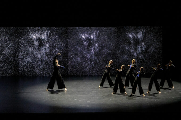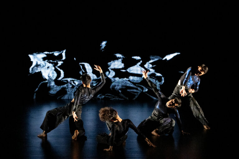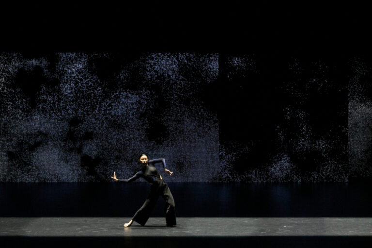 この砂粒の動きがゆったりしてくると、現実の世界では、ダンサーたちが素早いテンポでデュオの振付を展開する。逆に、スポットライトに照らされたダンサーが、身体内部の感覚に集中するように注意深く動くとき、映像の中の粒子は激しく動き回る。仮想と現実、それぞれの時間がコントラストを成しながら同じ舞台空間のなかを並走することで、静と動の表現がそれぞれに引き立っていた。手の甲と甲とを合わせ、祈りのポーズのように胸に当てるダンサーたちは、背後に流れる映像の忙しなさを他所に、澹澹とした水面のような穏やかさを守る。