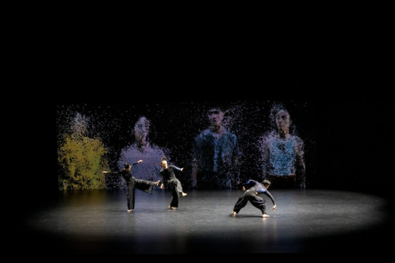 本作『WAVES』は、2020年よりクラウド・ゲイト・ダンスシアター(雲門舞集)の芸術監督を務める鄭󠄀宗龍と、日本を代表するメディアアーティスト真鍋大度による構想のもと、この透明な「波」の概念をテーマに創作された。コラボレーションに際して真鍋のチームは、筋電センサーやカメラを使い、ダンサーの呼吸や筋肉の収縮を捉えたという。そのデータはAIによって処理され、知覚可能な色や音に変換された¹ 。『WAVES』では、こうして制作された映像や音、ダンサーたちの身体が共演する。