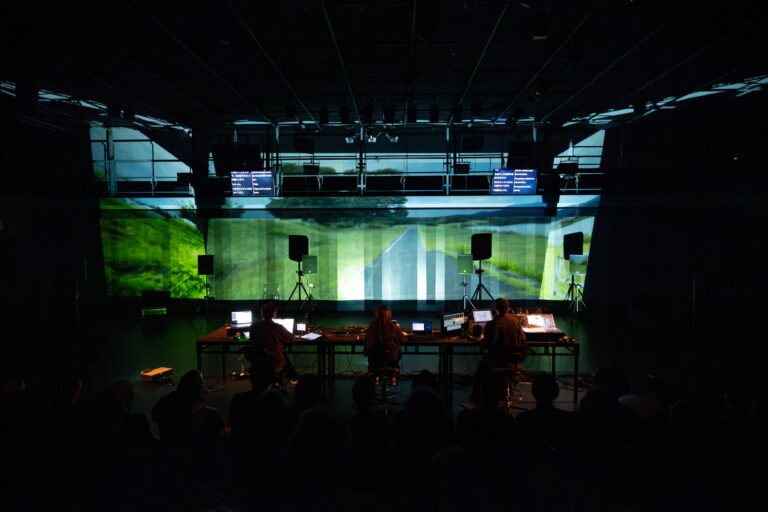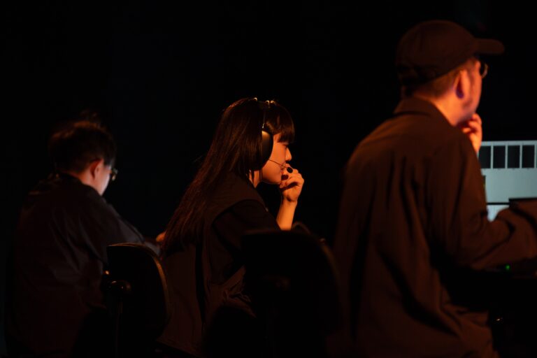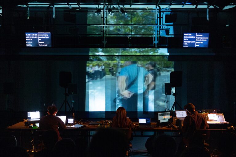 黒い服装の彼らは黒子のように自身の姿を消しつつも、身体から発する声と、機器類を手で動かすテクノロジーで存在を示し、かつ三人という数が絶妙な安定感をもたらした。鼎談のように言葉を交わすことのない横並びだが、三人協同のタスクは、ジャックを差替える電話交換のように実装され、鑑賞者と一緒に今という時間を共有したのかもしれない。