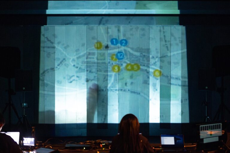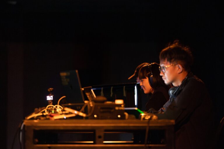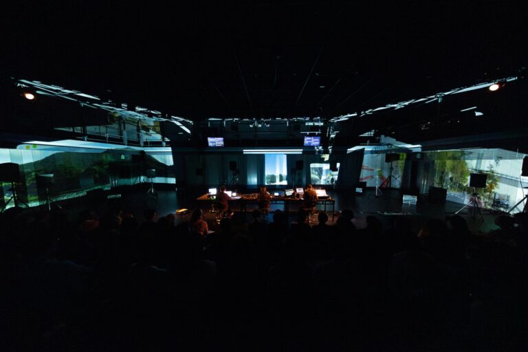 ——“change”。タイトルに含まれた「交換」の英訳はそれが相応しいと感じた。というより、それがメインタイトルなのだと思うことにした。客席の前には長机が横並びにおかれ、そのうえにミキサーやラップトップなどの機材がところ狭しと配置されていた。間隔をあけておかれた三つの椅子が、機材が行うこと、そこに座る者の業務を示している。操作されている画面に——zoomだろうか——ビデオミーティングツールの操作画面が覗く。だが壁面に投影された映像にそのインターフェースは現れない。音声の多重化、映像の多元化は、DJあるいはVJよろしく行われた、二次的な操作だ。投影された壁の上部脇に、おそらく場内に響き渡る音声情報をリアルタイムで書き起こし、かつ英訳する自動的な字幕翻訳が流れている。客席から不自然なタイミングでくすくすと漏れる笑い声は、ナンセンスな誤訳に向けられたものだったと気づく。つまり、ここで行われていることの実態は、「変換(change)」というカスタムだ。