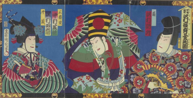 「三番叟 真中橋劇場廓開」翁(2代)沢村訥升、三番叟(4代)中村芝翫、千歳(3代)沢村田之助 豊原国周 作 東京都立中央図書館 所蔵