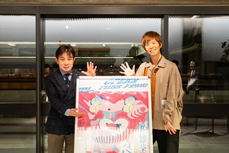 来月に迫った2025年度 全国共同制作オペラの最新作、 ドニゼッティ 歌劇『愛の妙薬』の関連イベントとして、ツアー最終地の京都公演をさらに味わっていただくために、演出の杉原邦生さんと、オペラ評論家の香原斗志さんによるスペシャルトーク「杉原邦生(演出)×香原斗志(オペラ評論)トーク ドニゼッティ『愛の妙薬』を語りつくす!」を開催しました。京都公演キャストの魅力から、杉原さんの演出ならではの見どころ、オペラはじめての方へのオススメの観方までたっぷり語り合った、充実のトークレポートをお届けします。