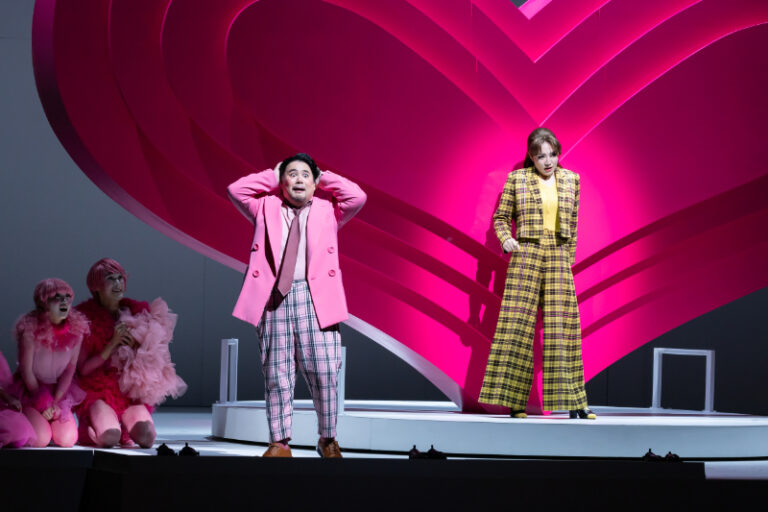 それに加えて、ジェンダーバイアスの解放も見られた。例えば、女性のアディーナの衣装は「男性らしい服装」とされているジャケットとパンツ(そして黄色!)、そして男性のネモリーノの衣装は「女性らしい色」と思われがちなピンク色のジャケット。「もちろん恋愛はヘテロセクシャルだけのものではないですから、もっと広がりをもった形で届けたいと思いました。そして、女性はこういうもの、男性はこういうもの、といった固定観念も取っ払いたかった」と意図を語る。