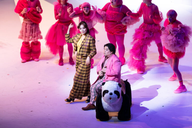 しかしながら、原典尊重が原則のオペラ上演で、キャラを変えることは音楽を変えることなので、とてもむずかしい。ではどうするのか?音楽を変えずに、歌っていない場面を含む演出(舞台美術や衣装、さらには登場人物たちの振る舞い、表情等々)で何かすることはできます。今回演出を担当した杉原邦生さんの場合、色々な〈同時代的発想〉をもちこんでいます。
